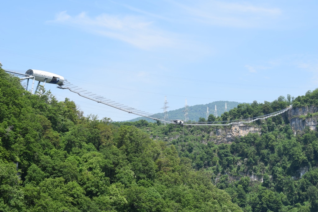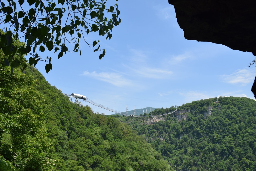 От входа в Ахштырскую пещеру открывается красивый вид на Ахштырское ущелье и мост Скайпарка для экстремальных прыжков с большой высоты на эластичной ленте.