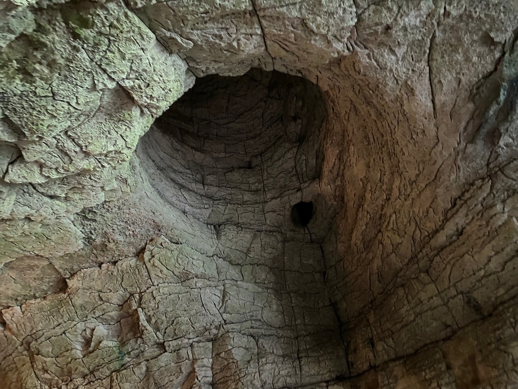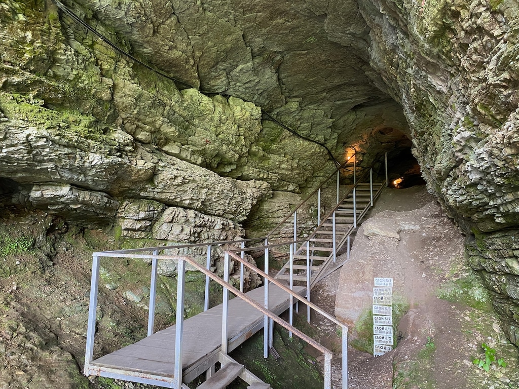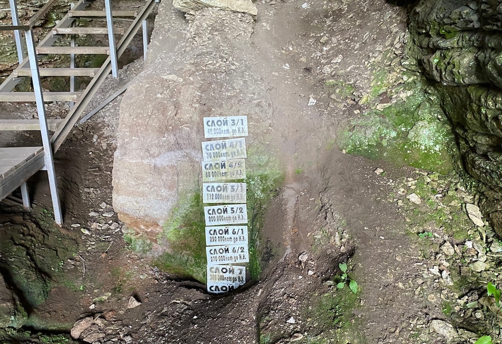 Внутрь пещеры ведет узкая лесенка, рядом с которой можно воочию увидеть все культурные слои, обнаруженные археологами. Рядом выставлены таблички с датировкой. Видно, что слои различаются по цвету, что свидетельствует об изменении климата.