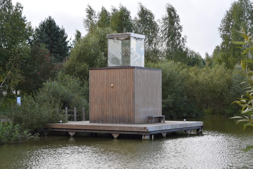 На берегу озера в стеклянном кубе укрылась люстра. Вместо освещения квартиры люстра почему-то освещает окружающее пространство — совершенно бесполезное занятие особенно при свете дня.