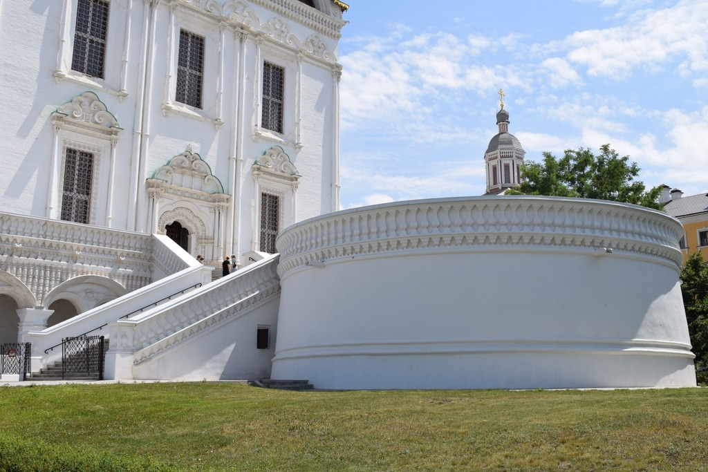 К собору примыкает круглое в сечении строение, которое называется «Лобное место». Его диаметр составляет 15 метров. Обычно Лобное место в старое время предназначалось для того, чтобы отрубить голову. Но Лобное место Успенского собора имело совсем другое назначение. С него зачитывались указы и делались важные для горожан сообщения. Вообще в России сохранились только два Лобных места: московское и астраханское. На московском вот уж точно проводились казни.