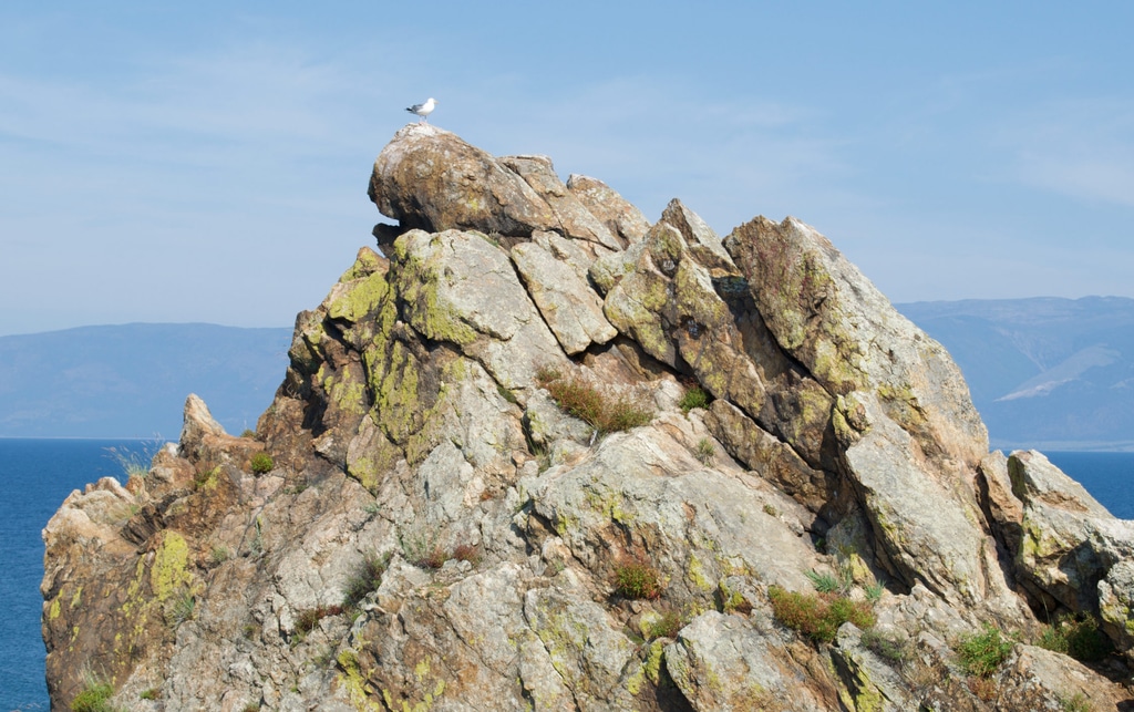 На самую верхушку скалы уселась одна из чаек, которые вместе с голубями составляют почти все птичье население Ольхона.