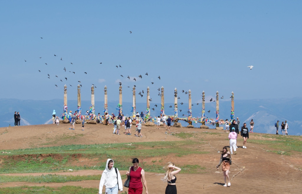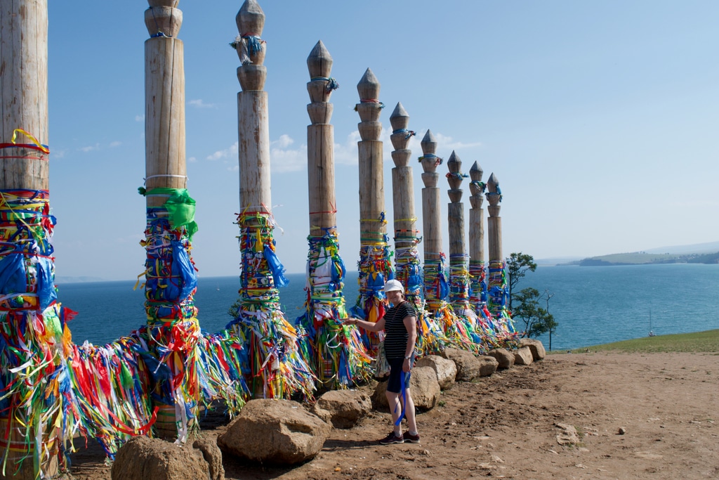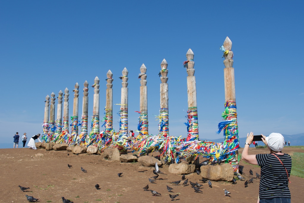 От мыса Богатырь следуем дальше к двум главным достопримечательностям Ольхона: скале Шаманке и столбам сэргэ.