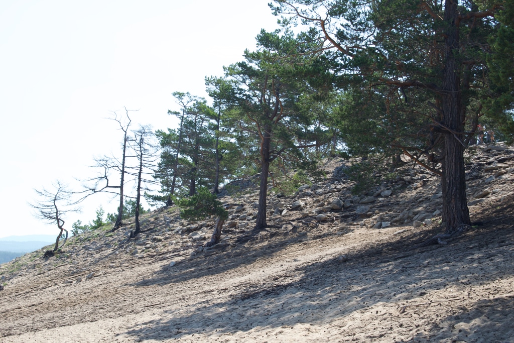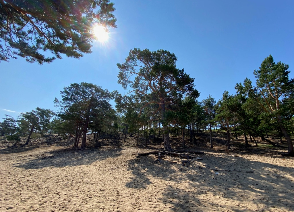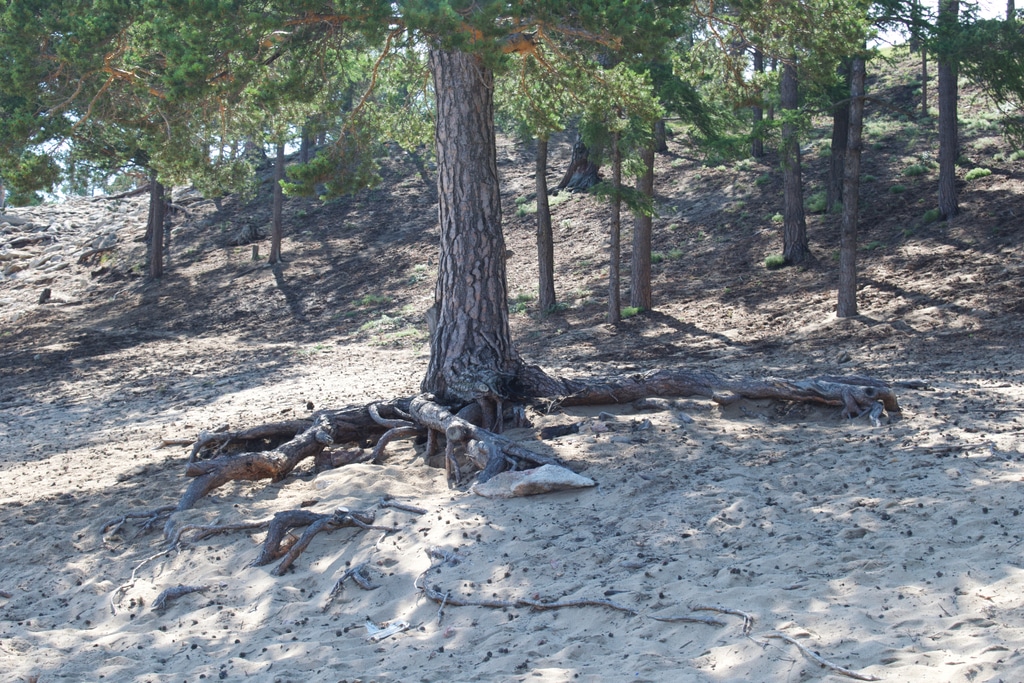 Совсем близко от берега прямо на песке растут сосны. Их корни оголены и за счет этого кажется, что они стоят на ногах. Кажется, что эти сосны вот-вот пойдут.