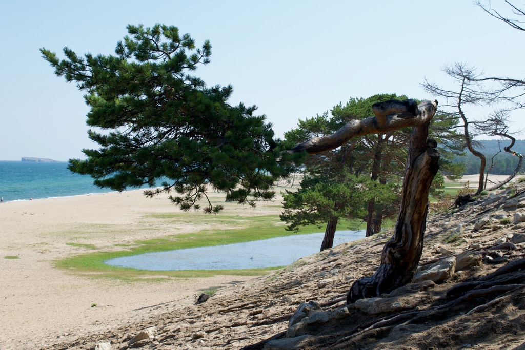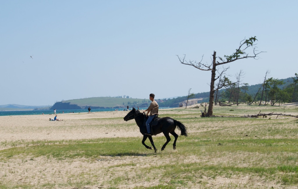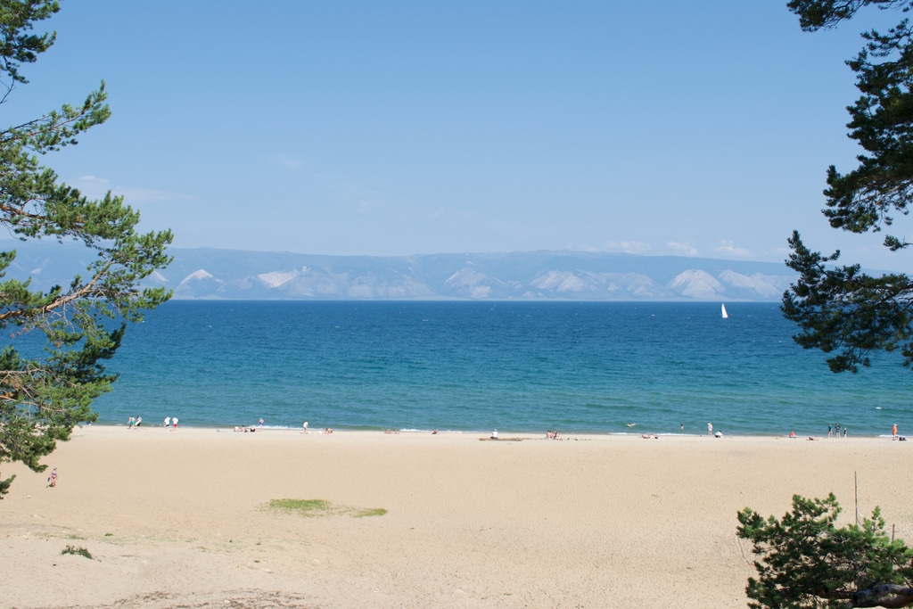 В нескольких минутах ходьбы от столбов сэргэ вдоль берега Байкала тянется довольная широкая песчаная полоса под названием «Сарайский пляж».
