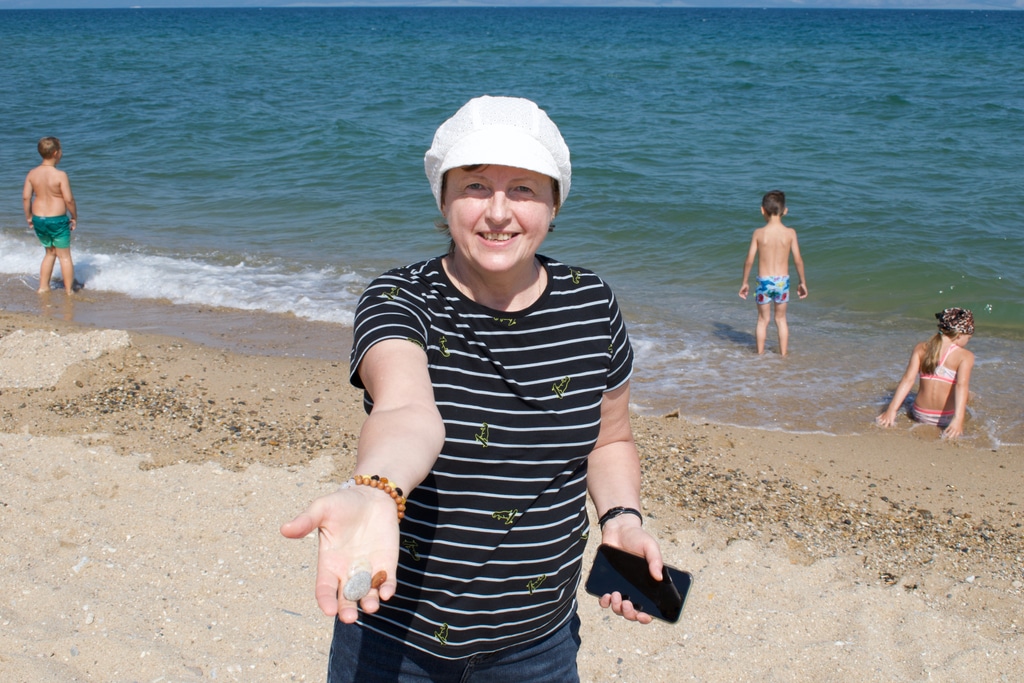 На пляже удивительно много красивых камней. Каждый из них впитал в себя энергию этого прекрасного озера.