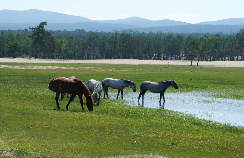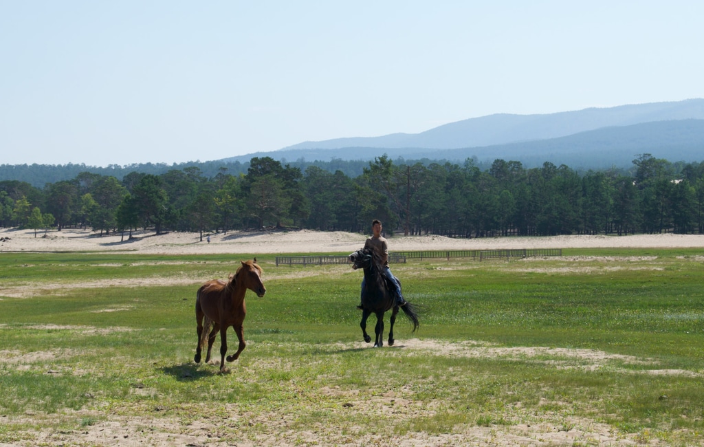 Животных сопровождает юноша на лихом коне, по всей видимости, бурят.