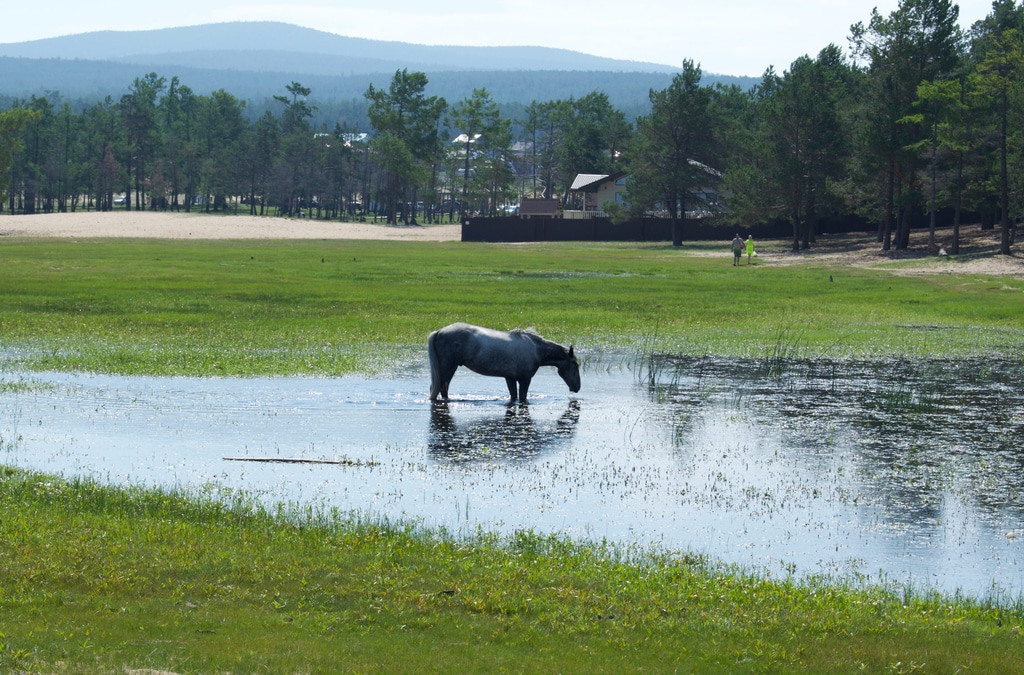 Чуть дальше раскинулась лужайка с небольшим озерцом, к которому пришли на водопой кони.