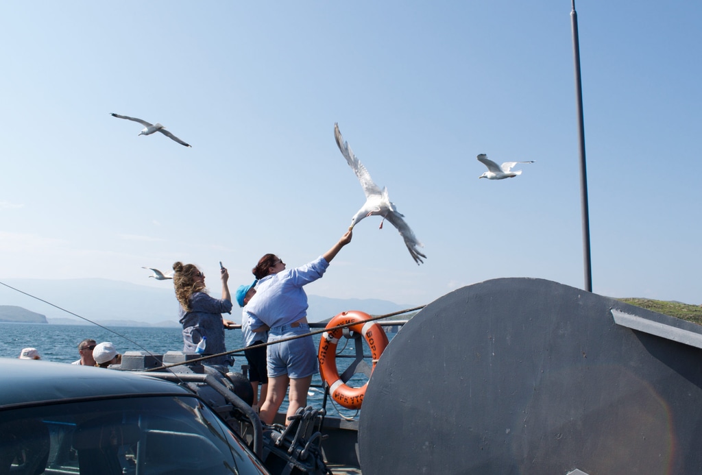 А еще сколько же здесь чаек! Они в огромном количестве сопровождают каждый паром и без всякого стеснения выпрашивают корм у туристов. Особо смелые из них хватают кусочки еды прямо из рук.