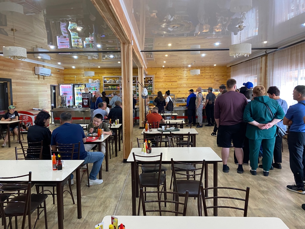 В нем можно покушать и сходить в туалет. Правда, первое не всегда удается: в кафе бывают длинные очереди.