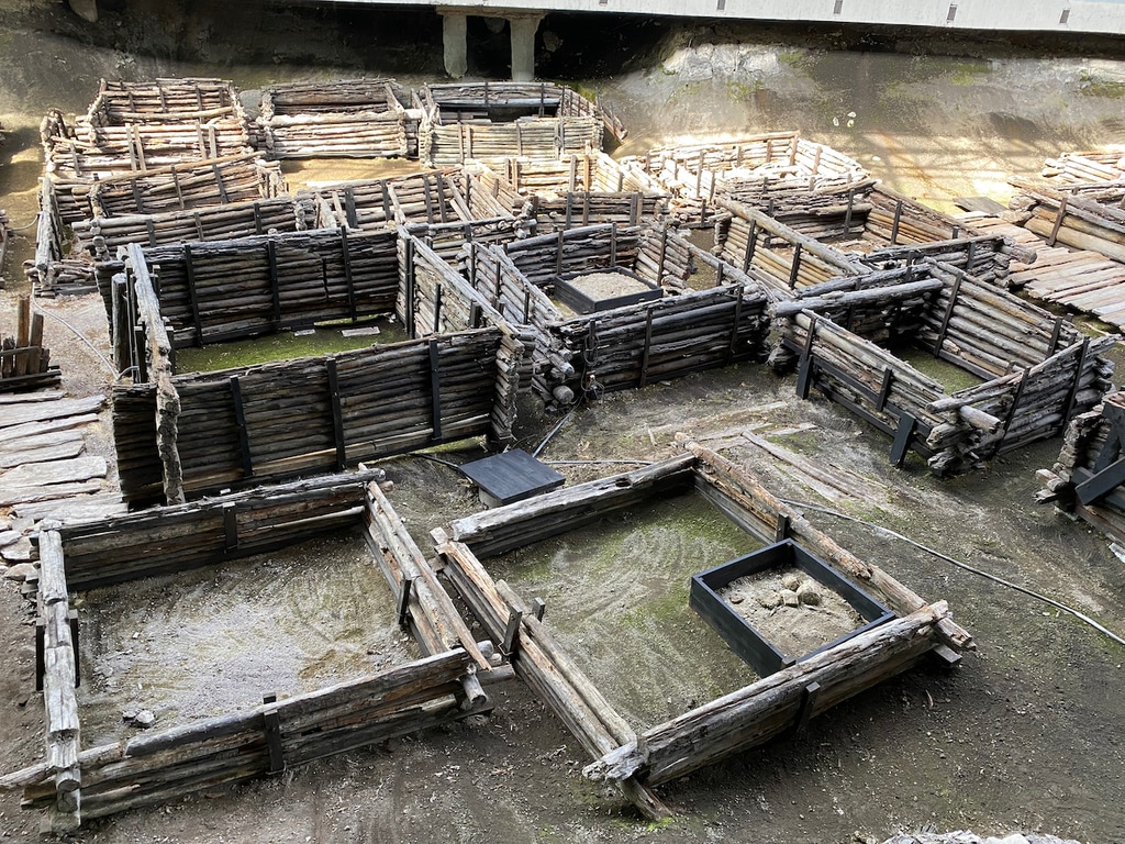 Между рядами построек хорошо видны улицы, которые в некоторых местах тоже застланы досками.