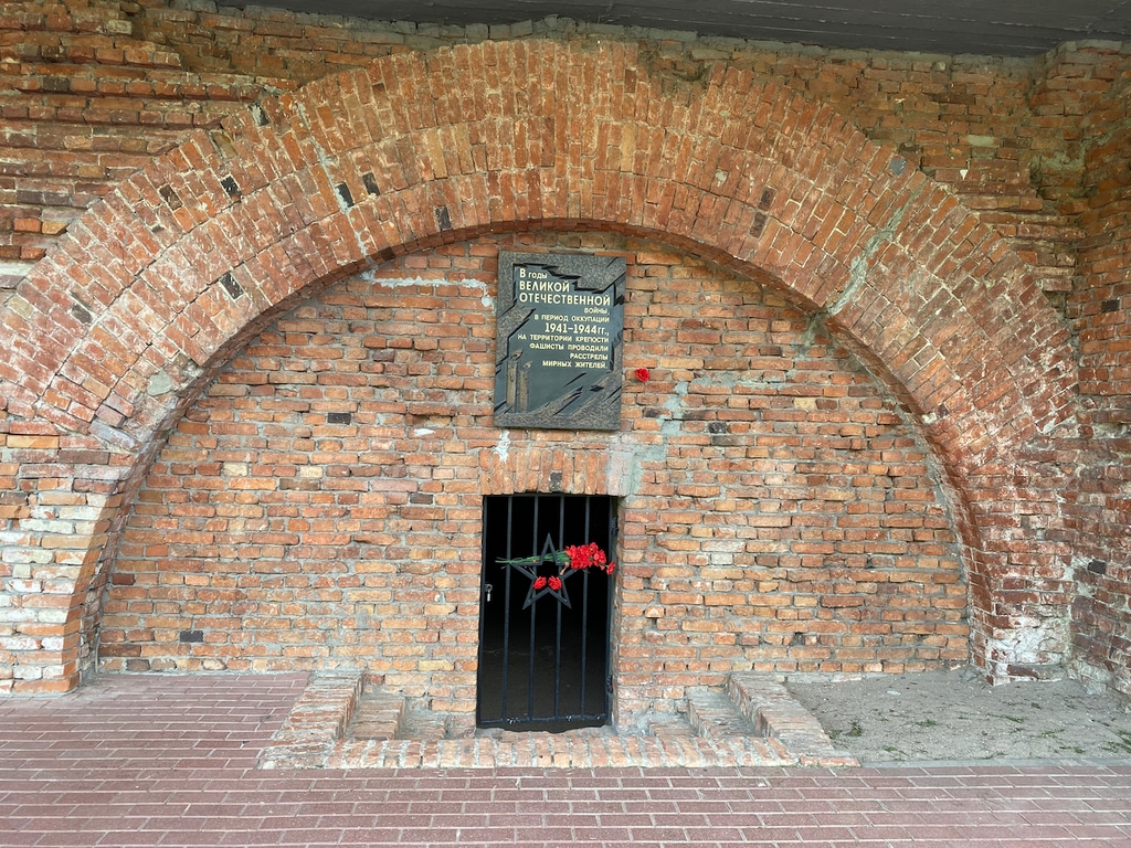Слева от входа виднеется вход за решеткой. Во время войны внутри каземата содержались заключенные. В основном, это были мирные жители, которых привозили в крепость на расстрел.