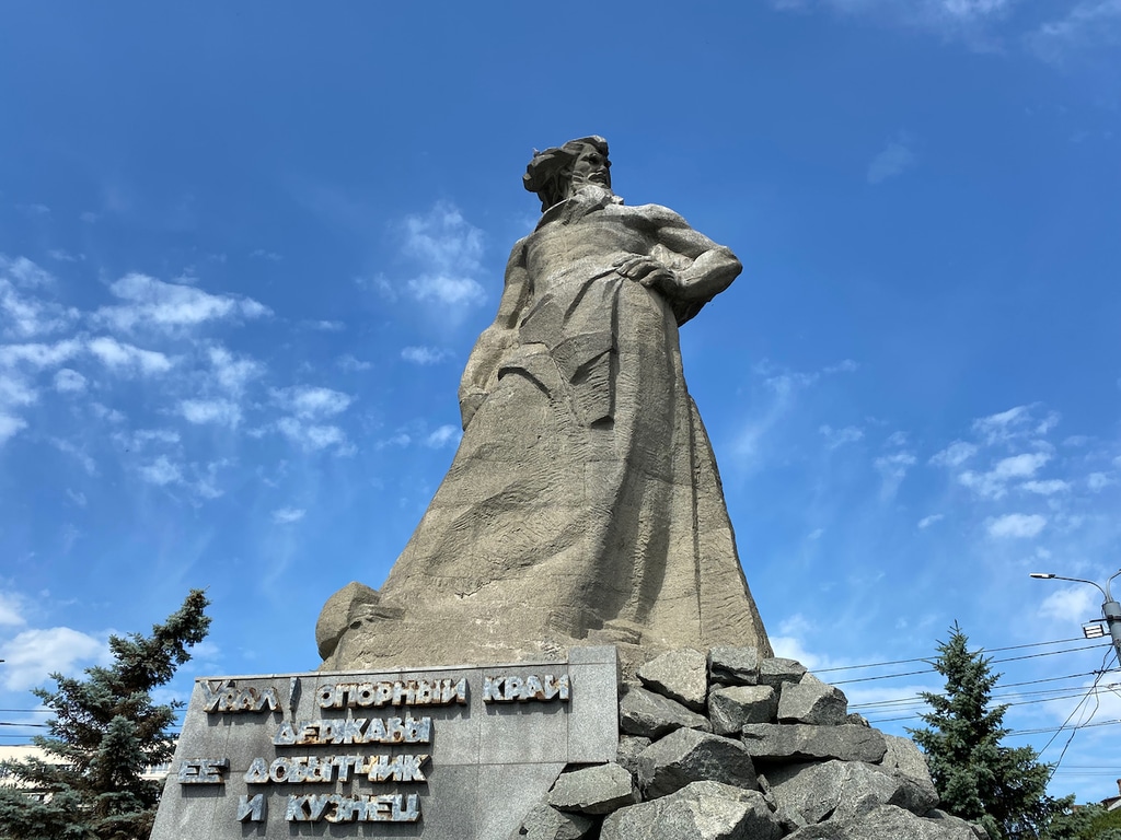 На постаменте памятника надпись: «Урал — опорный край державы, ее добытчик и кузнец».