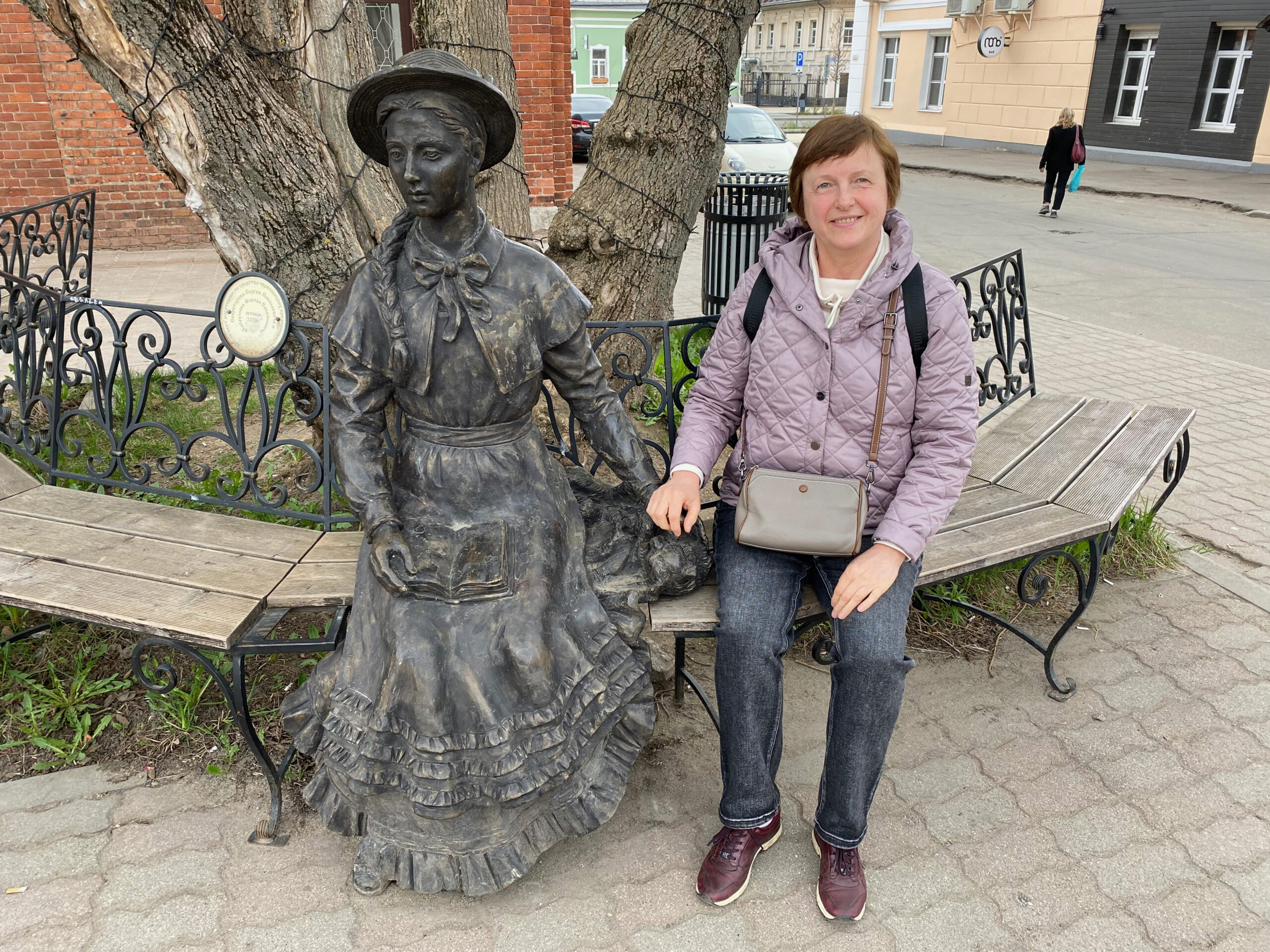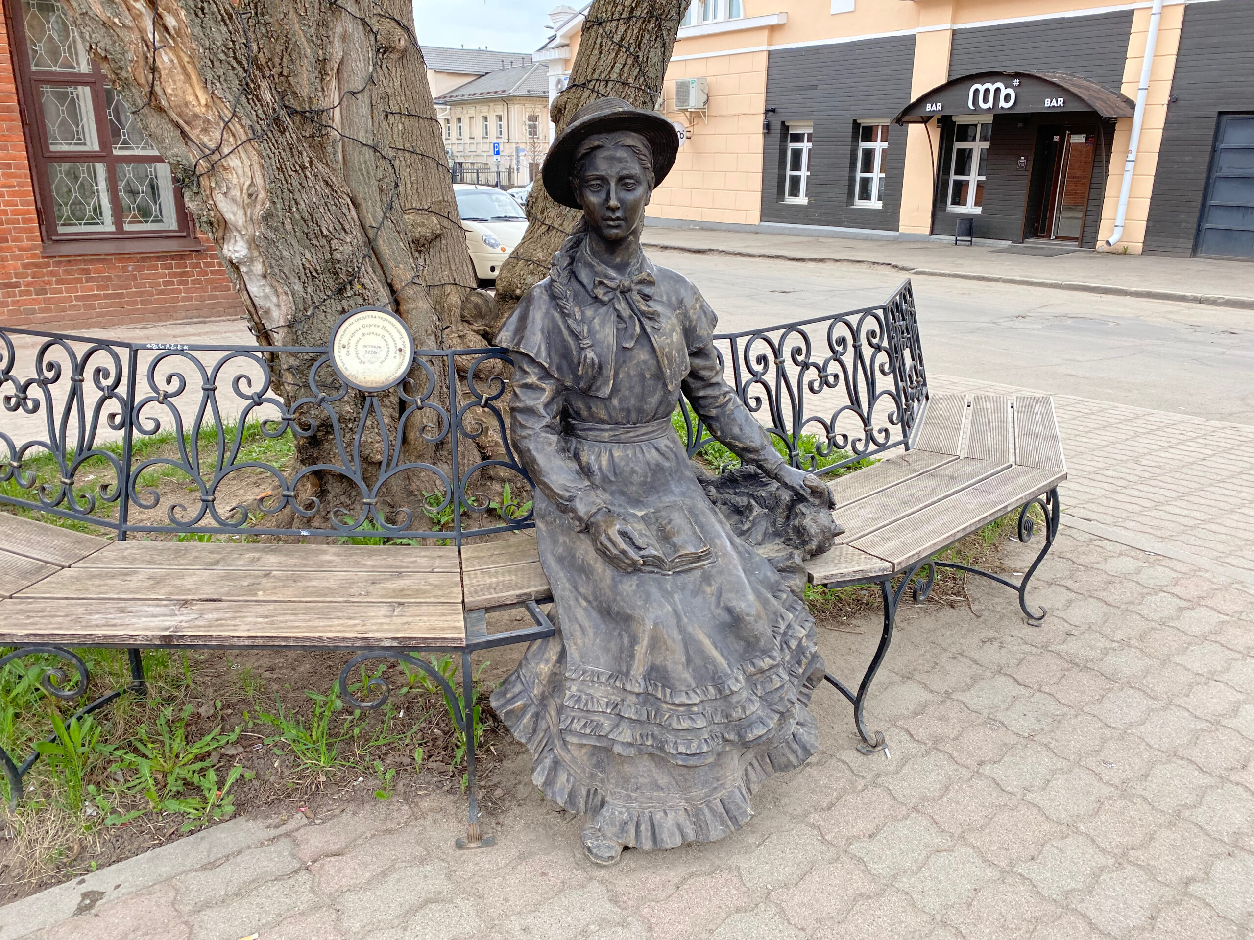 Гимназистка расположилась здесь неслучайно. Прямо перед ней здание бывшей женской гимназии, в котором сегодня работает Дворец бракосочетания.