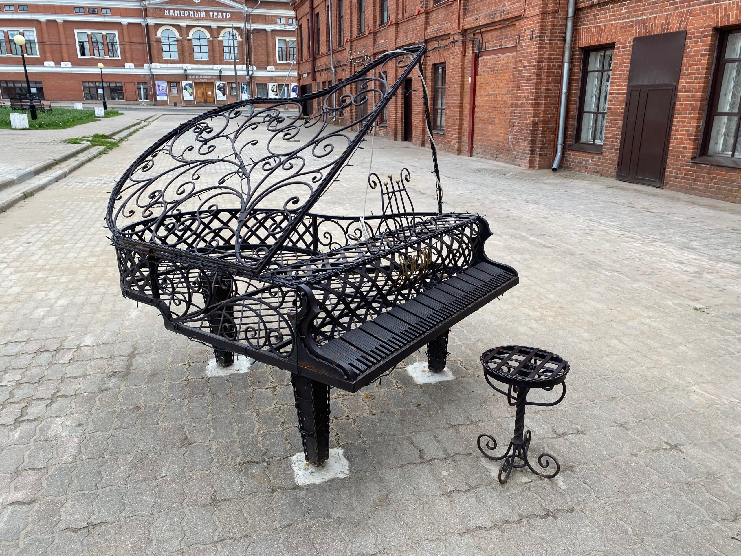 На площади Милютина рядом со зданием филармонии есть два трогательных арт-объекта, которые сразу притягивают взгляд. Это инсталляция в виде рояля и бронзовая девушка-гимназистка на скамейке.