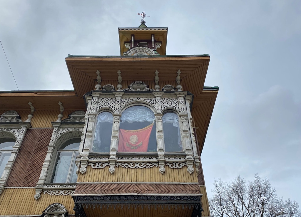 За стеклом углового балкона виднеется красное знамя с Ильичем.