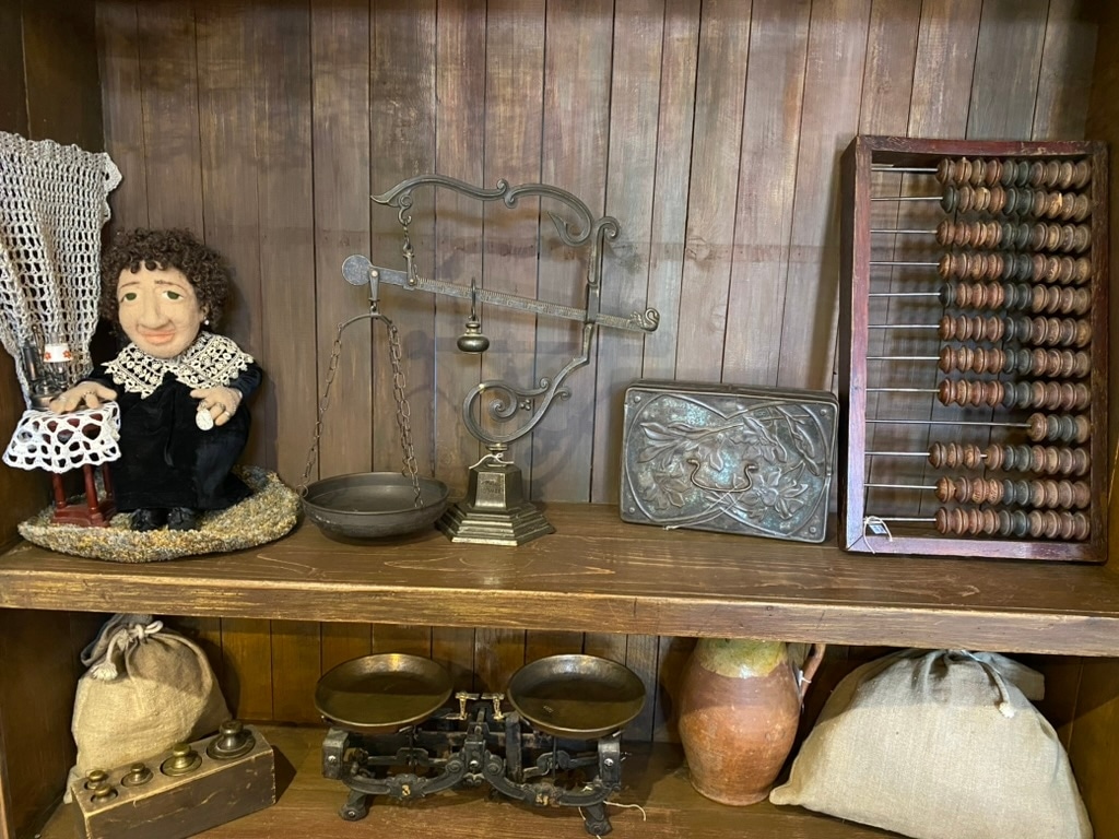 На полках старинные весы с гирями, деревянные счеты, мешочки с крупами и сахаром и даже кукольный человечек с грустной улыбкой на лице.