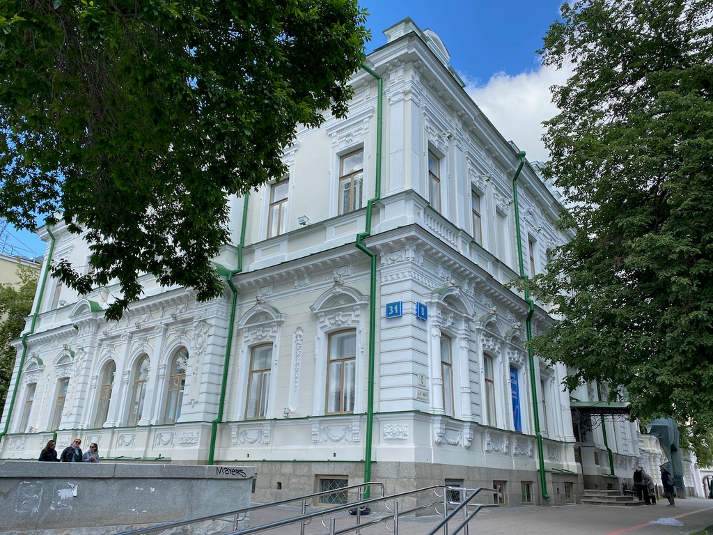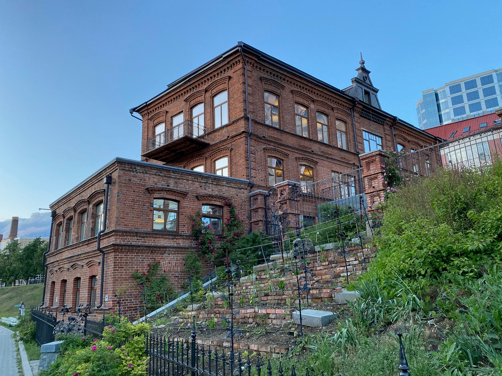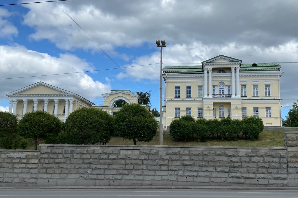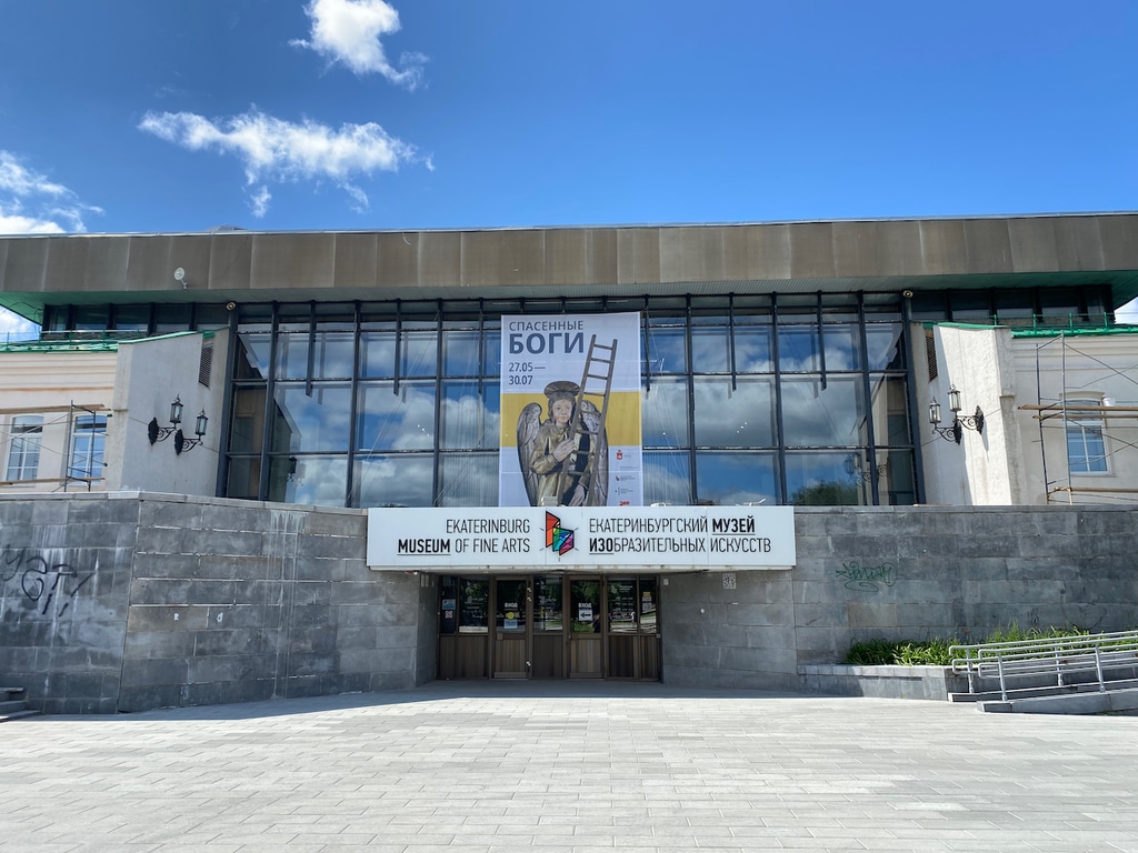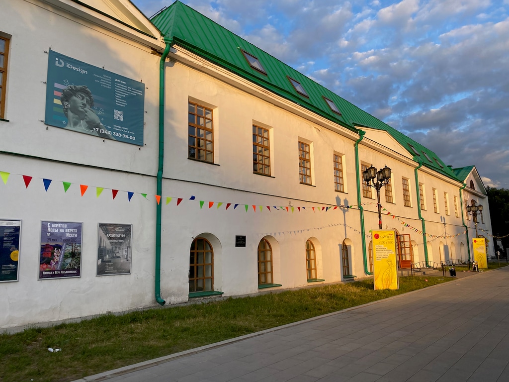 Напротив выставки заводской техники на другом берегу Исети возвышается здание музея изобразительных искусств. Много лет назад здание занимал госпиталь металлургического завода.