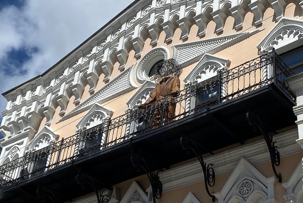 На балконе дома Коробковых не так давно поселился странный лев с туловищем человека. Стоит себе и поглядывает сверху на площадь.