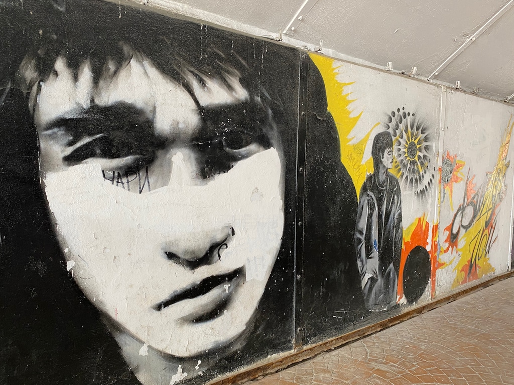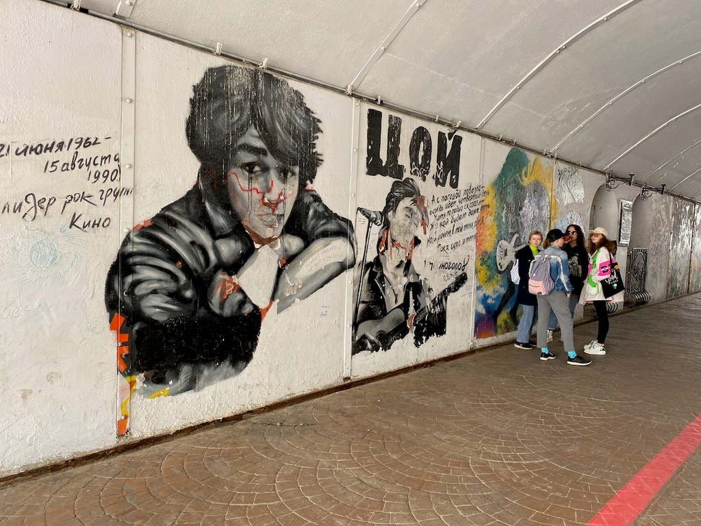 Справа от родонита в Плотинке проделан пешеходный переход, ведущий из Исторического сквера на улицу Ленина. Местные жители окрестили его переходом Цоя или просто»трубой». На стене — портрет солиста рок-группы «Кино», популярной в 1980-е годы. Музыканты приезжали в Екатеринбург с концертом в 1989 году. Через год Цоя не стало.
