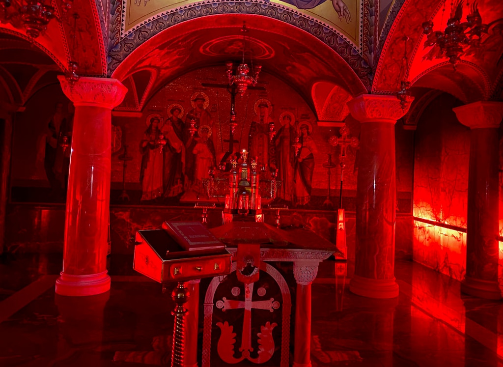 Одно из помещений храма подсвечено красным цветом — цветом крови. Примерно в этом месте находилась комната, в которой в ночь на 17 июля 1918 года произошла кровавая бойня.