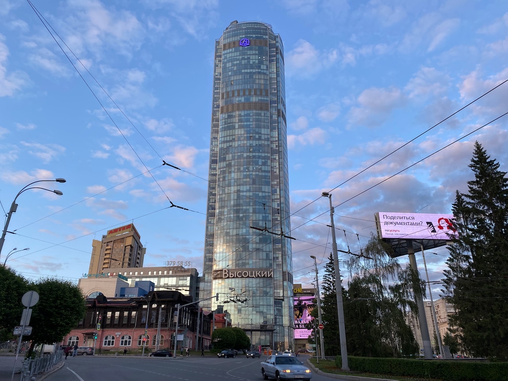 От башни «Высоцкий» по улице Малышева мы направляемся к Каменному мосту через Исеть.