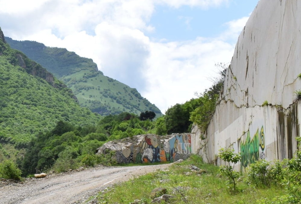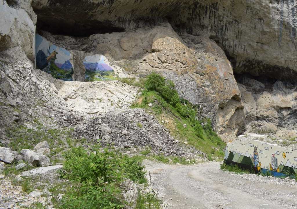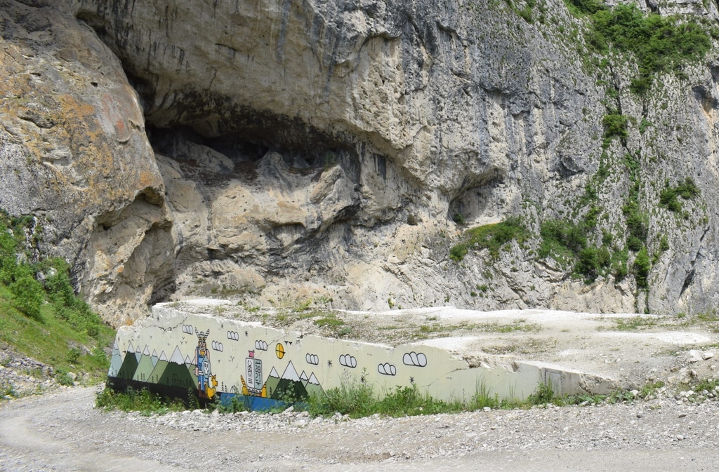 Эти граффити появились в 2021 году в рамках арт-фестиваля, когда сюда приехали художники из разных уголков нашей страны и в течении пяти дней украшали горные склоны. Так появилась самая большая легальная галерея граффити на Северном Кавказе.