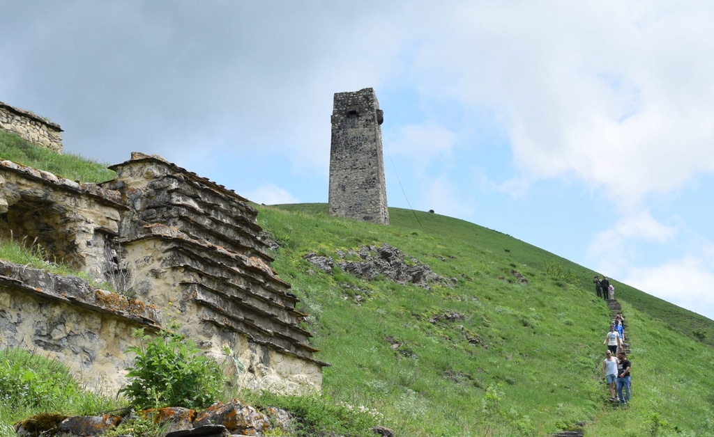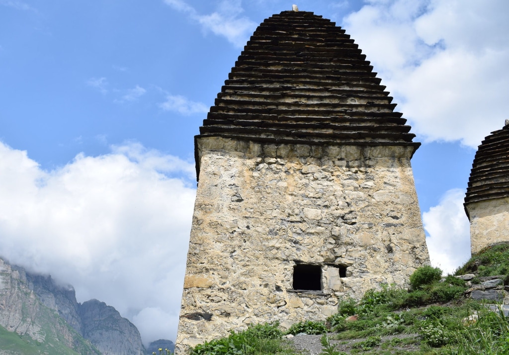 На горе над некрополем виднеется дозорная башня. Башни в горах Осетии в старину были привычным явлением. Обычно их строил какой-нибудь знатный род, простым людям это было не по карману. На строительство башни уходило так много материала, что среди осетин ходила поговорка: «Из разрушенного аула и одной башни не построишь, а из разрушенной башни можно построить целый аул», Башни в Осетии считались символом знатности и богатства рода и носили фамилию хозяина. Башня недалеко от Города мертвых носит фамилию Аликовых.