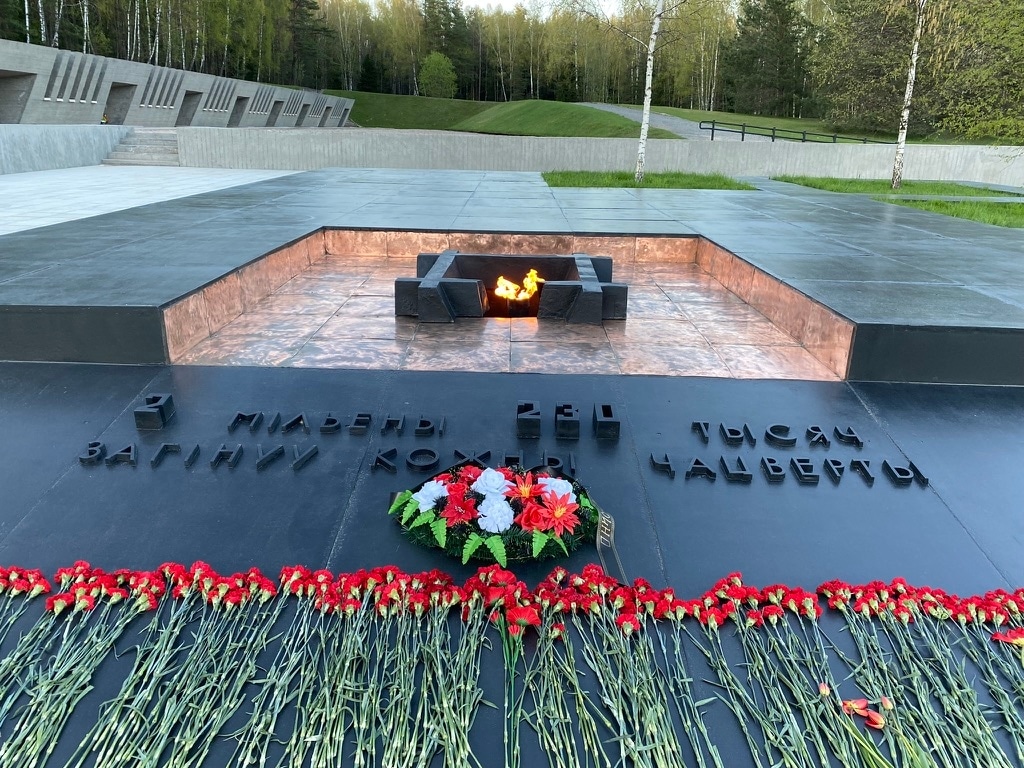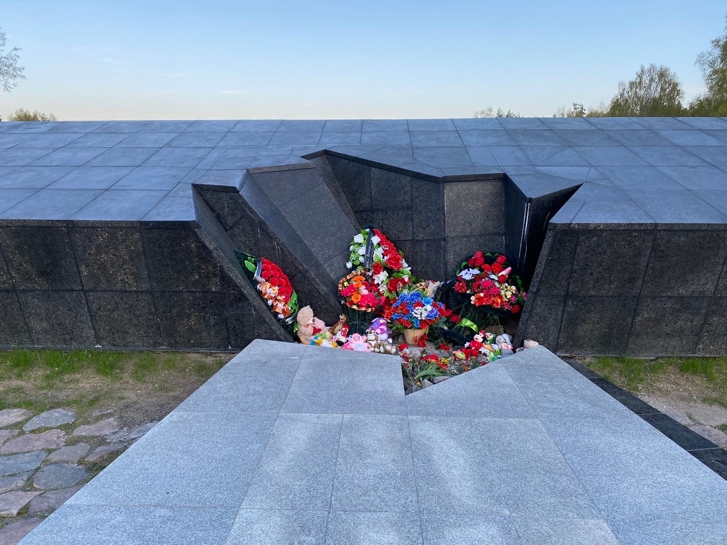 В плите обозначено место двери, в которую в панике и ужасе ринулись люди в надежде на спасение. Здесь всегда лежат цветы и игрушки. Половина сгоревших были еще совсем детьми.