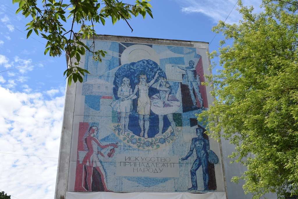 Памятниками советского прошлого в Иванове являются и сохранившиеся мозаичные панно на фасадах зданий. Правда, с каждым годом их становится все меньше и меньше, но до наших дней кое-что еще сохранилось. Одно из таких панно нам встретилось по дороге. На нем — три изящные советские грации по центру и ленинские слова: «Искусство принадлежит народу».