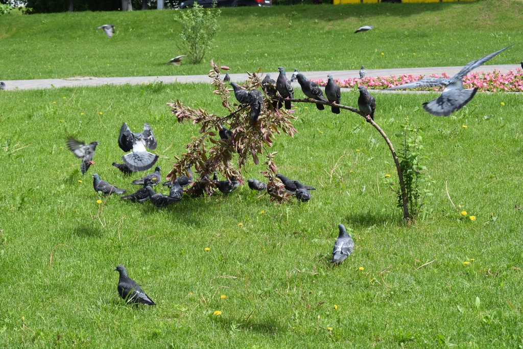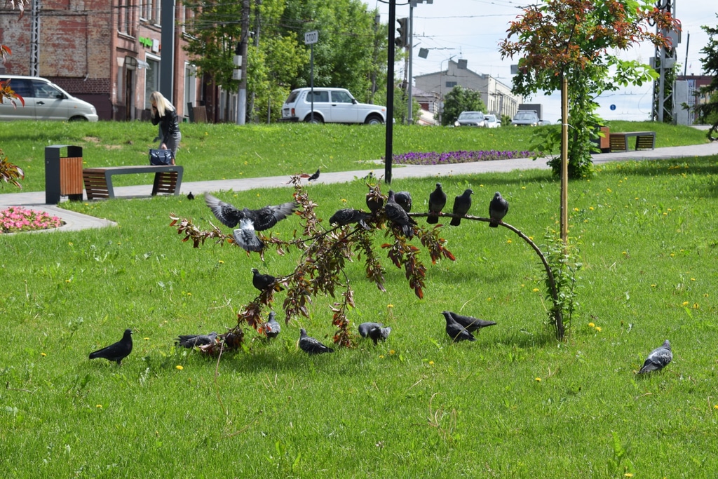 Рядом с храмом симпатичный сквер, а в нем мы увидели вот такое необычное зрелище. Голуби оккупировали молодое дерево и почти полностью пригнули его к земле. Не знаю уж, чем им приглянулось именно это дерево, когда рядом были и другие точно такие же.
