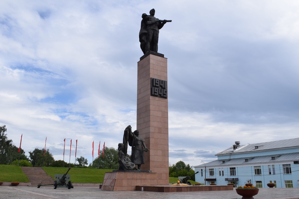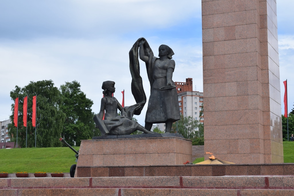 В память о боевых и трудовых подвигах в годы Великой Отечественной войны 1941-1945 годов в центре Иванова установлен вот такой памятник. Советский солдат на высоком постаменте, у подножия которого две женщины-текстильщицы.