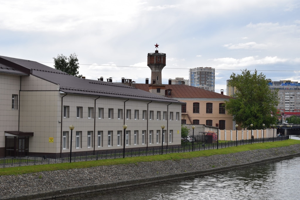 На набережной сохранились дореволюционные постройки 19-20 веков. Буквально сразу бросается в глаза башня с пятиконечной звездой. Оказалось, что это водонапорная башня 1910 года постройки. Она находится на территории бывших фабричных складов, построенных еще раньше, в середине 19 века. Звезда должно быть осталась от давно ушедшего революционного прошлого города.