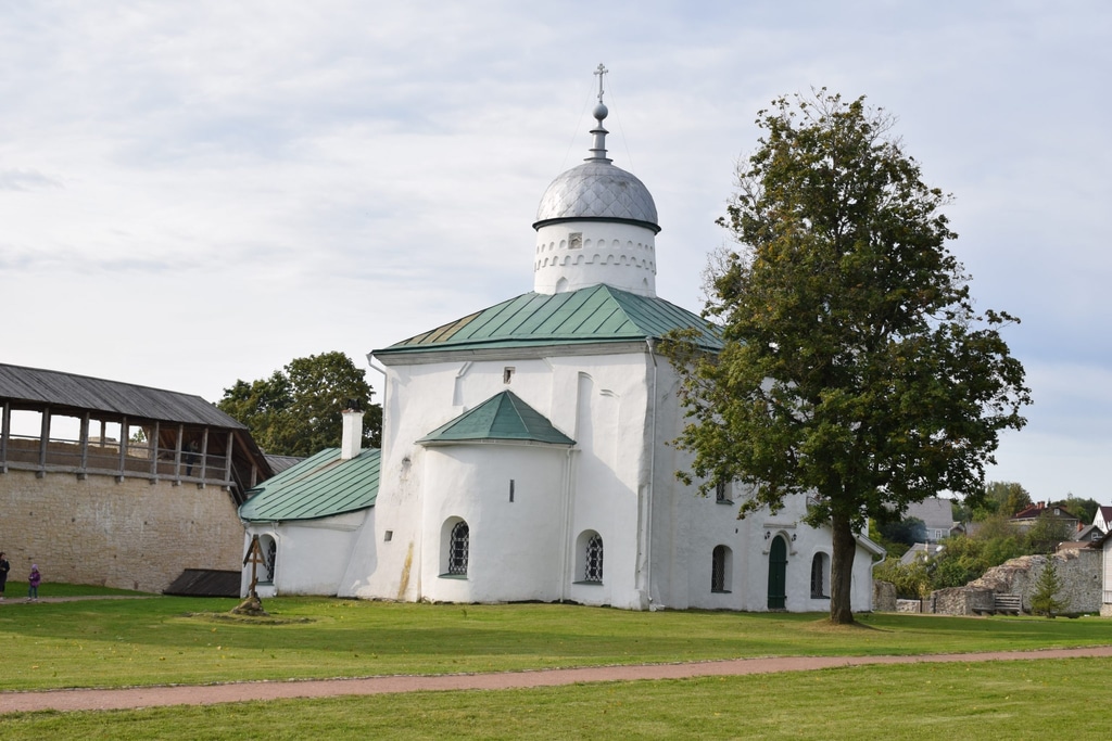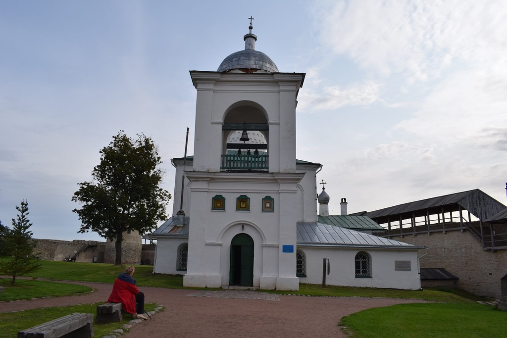 Как только мы оказались внутри крепости, перед нами открылся отличный вид на Никольский собор. Точная дата постройки храма, к сожалению, неизвестна. Однако согласно летописям он существовал уже в 1341 году, когда на Изборск напали немцы.