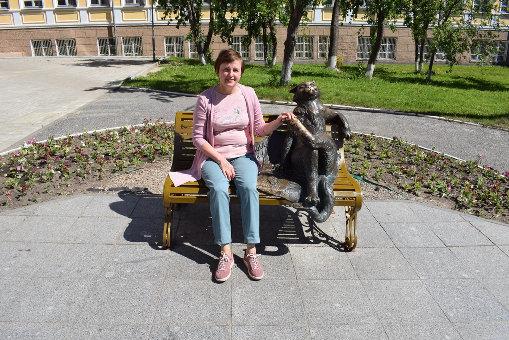 Наконец-то мы добрались до знаменитого Йошкиного кота. Он греется на лавочке буквально в двух шагах от площади Оболенского-Ноготкова рядом с Марийским университетом. Здесь, пожалуй, лучшее место в городе для фото на память.
