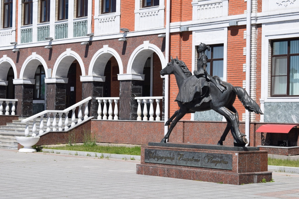 Перед зданием — изящная фигурка юной императрицы Елизаветы на лошади. Как известно, императрица была большой фанаткой и покровительницей изящных искусств.