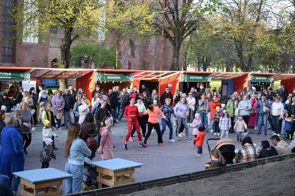А еще вокруг Кафедрального собора всегда очень людно. Это любимое место горожан и туристов. Особенно много людей в праздничные дни. Все пространство вокруг храма уставлено торговыми палатками. Возле них толпится народ. Да и потанцевать калининградцы совсем не против. Так отплясывали калининградцы в первомайские праздники.