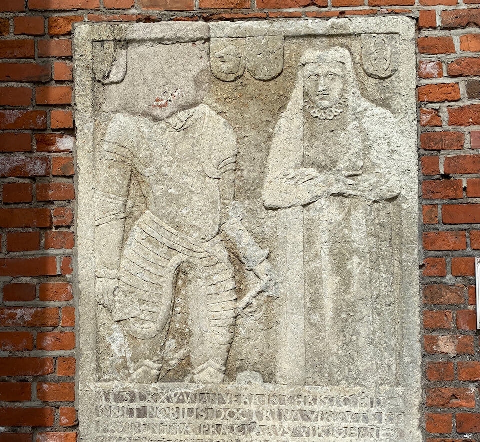 Супруги скончались в один и тот же год с небольшим разрывом во времени. К сожалению, голова канцлера не сохранилась, а вот даму 16 века можно разглядеть.