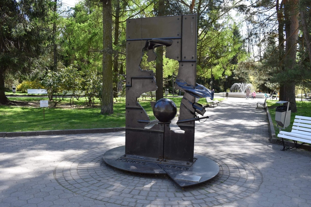 Ниже одна из скульптур парка под названием «Мир без войны». Еще одно название этого произведения, уже народное, — «Из кожи вон». Даже не знаю, которое подходит лучше.