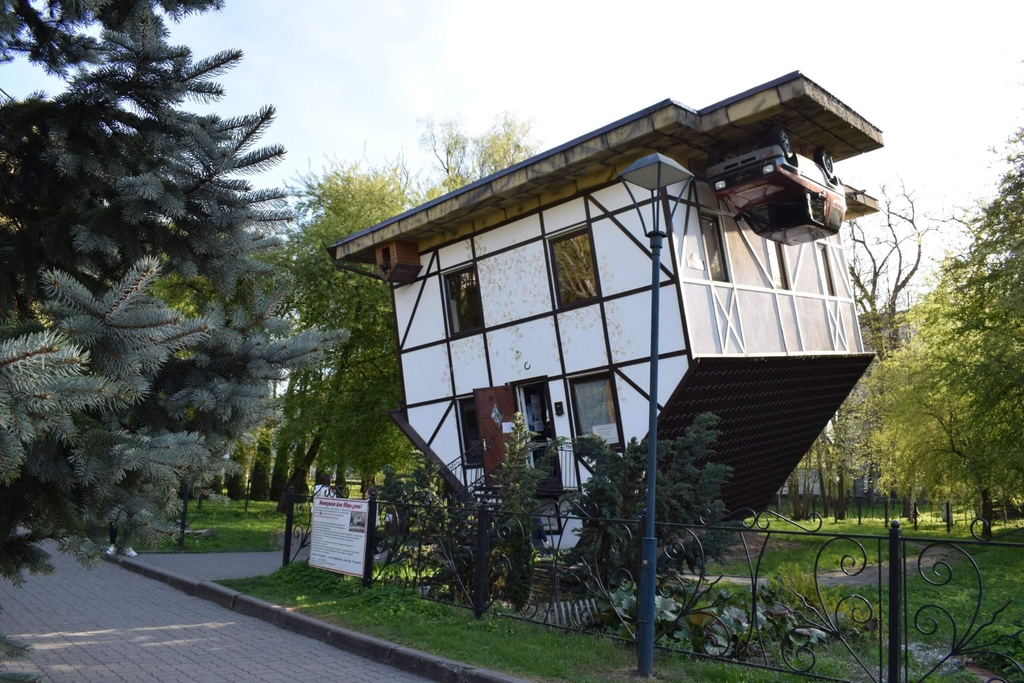 Также в парке есть аттракционы, зеленые зоны для прогулок, интересные памятники и вот такой перевернутый вверх тормашками домик. За отдельную плату можно посмотреть, что там у него внутри.