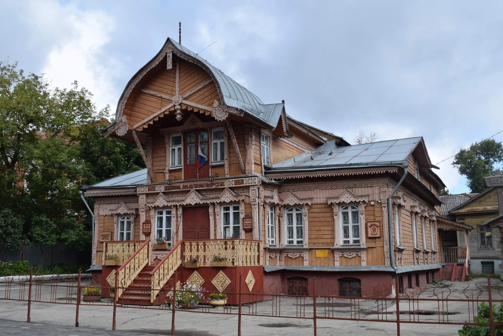 Дальше в нашем маршруте вот такой деревянный дом в древнерусском стиле конца 19 века. Дом на своем веку повидал много хозяев от князей до жителей коммуналок. В конце концов в 1990-е годы городские власти его отреставрировали и открыли в нем музей быта крестьян Калужской губернии.
