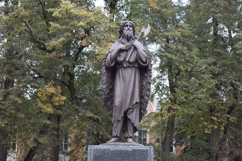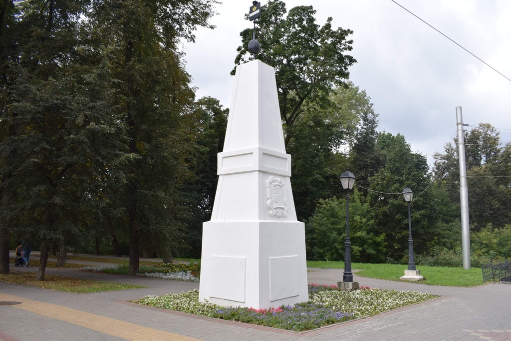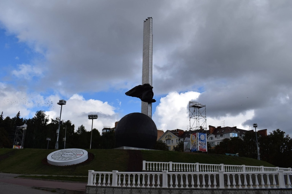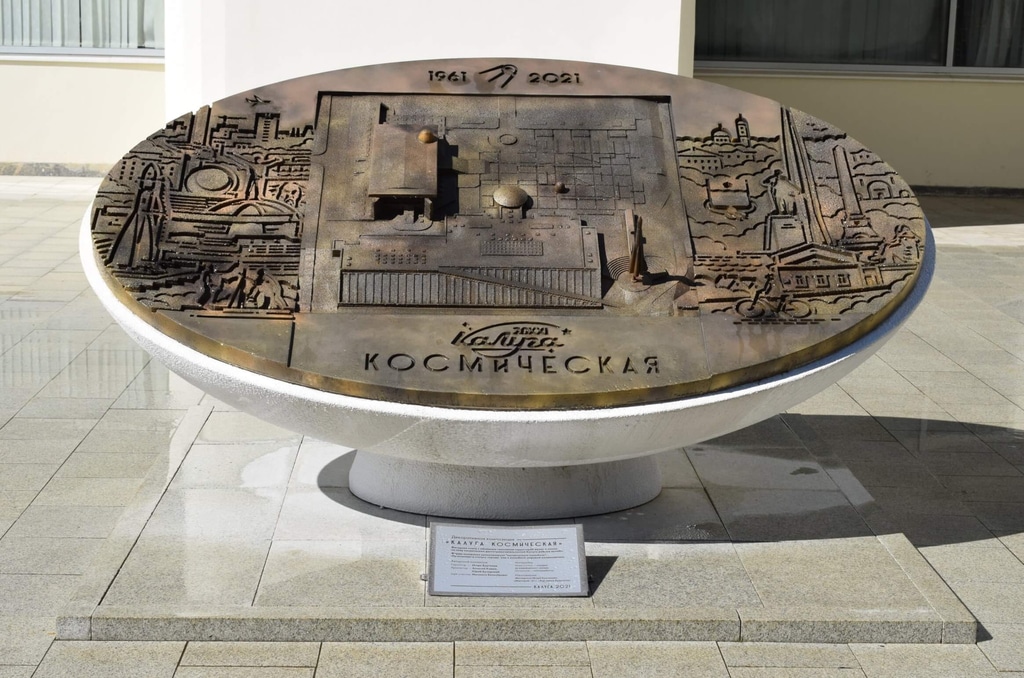 Справа по курсу — памятник, установленный в честь 600-летия Калуги. И снова в нем прослеживается космическая тема. На высоком монументе изображена голова космонавта в шлеме, у подножия монумента — сфера, воплощающая в себе планету.
