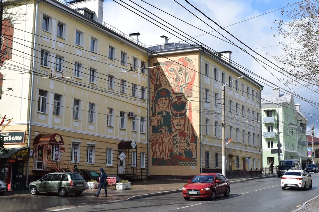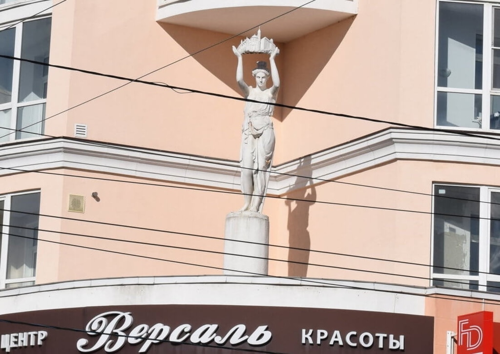 А дальше наше внимание привлек угловой жилой дом советского периода. В угловой нише фасада — скульптура музы архитектуры. В своих руках муза держит главные достопримечательности Калуги. Это Гостиный двор, Троицкий собор и Музей космонавтики.