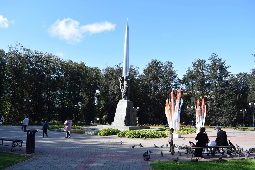 В центре площади на высоком постаменте — скульптура женщины с искусственным спутником в руках. Спутник был первым крупным достижением советской страны после войны.