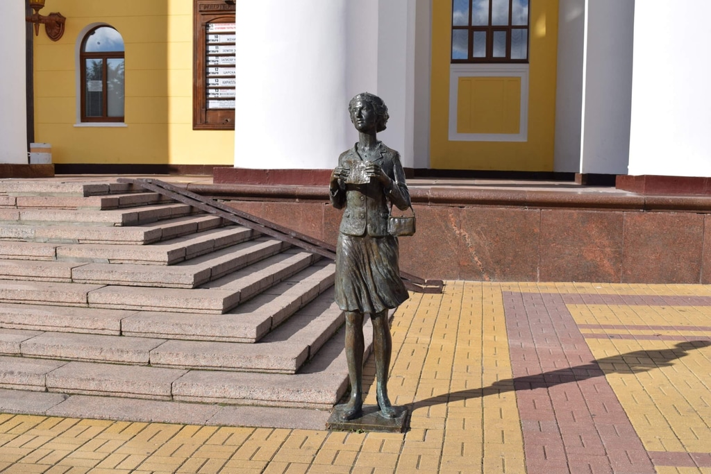 У входа в драматический театр стоит трогательная скульптура девушки-театралки. Она держит в руках листок бумаги с надписью: «Нет лишнего билетика?»