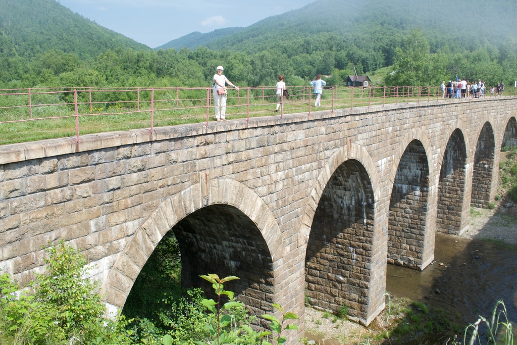 Арочный железобетонный мост через реку Ангасолка строили долго с 1911 по 1915 год. Главной тому причиной был сложный рельеф местности.