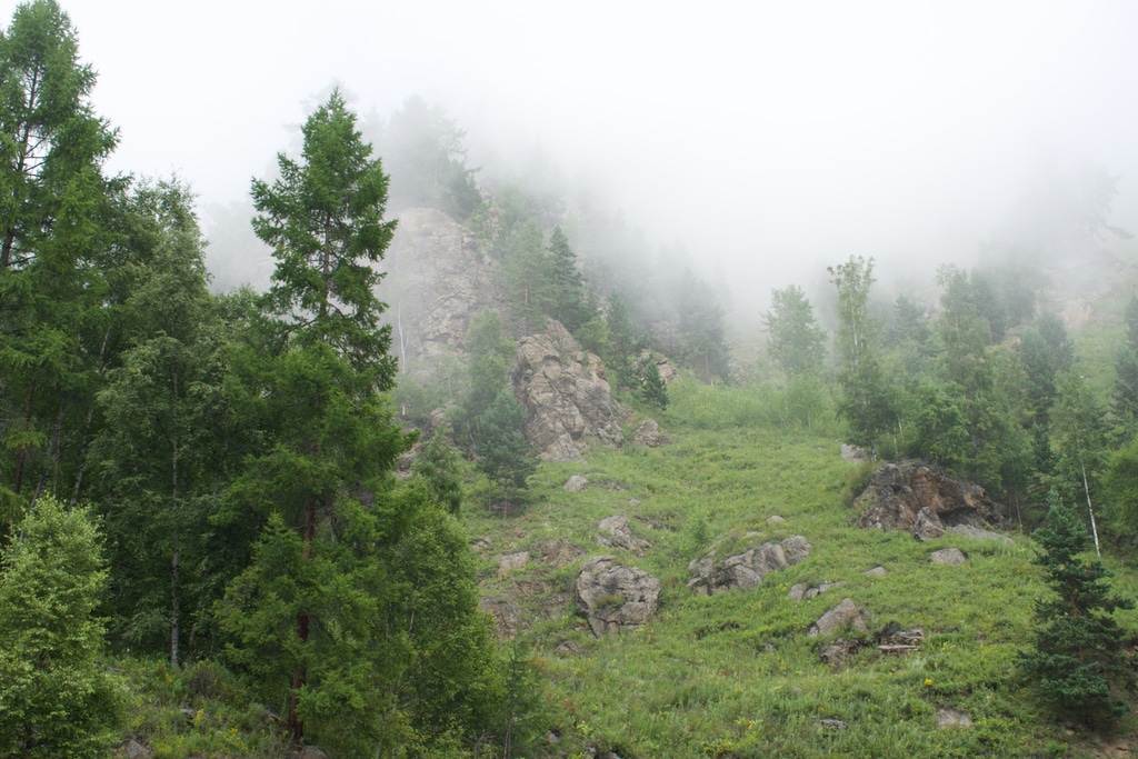 На этом участке КБЖД туман стал уже совсем густым и озеро видно плохо.
