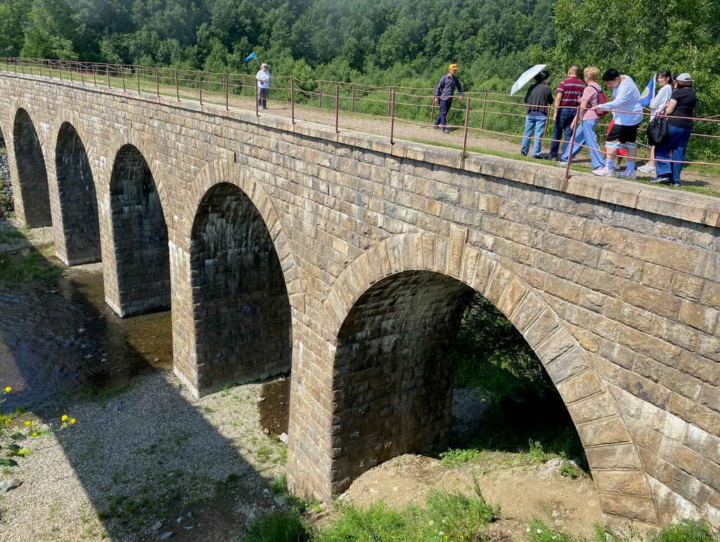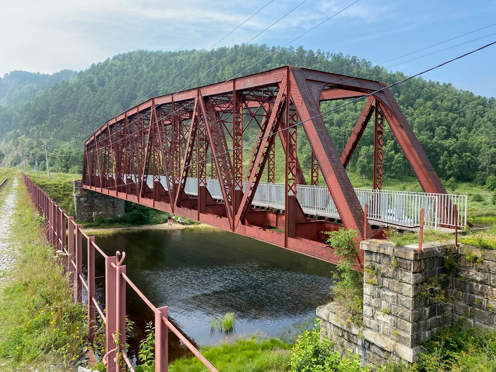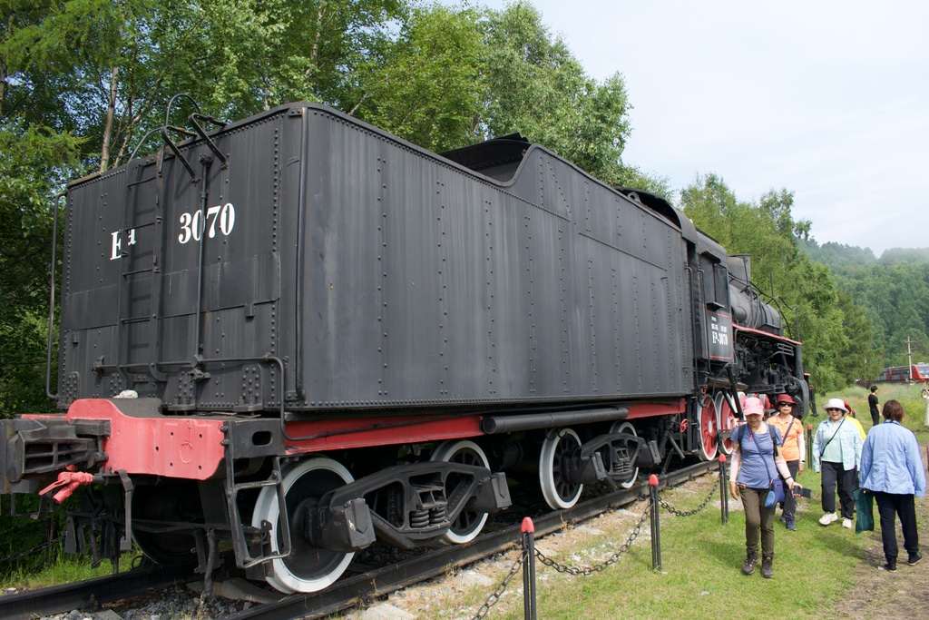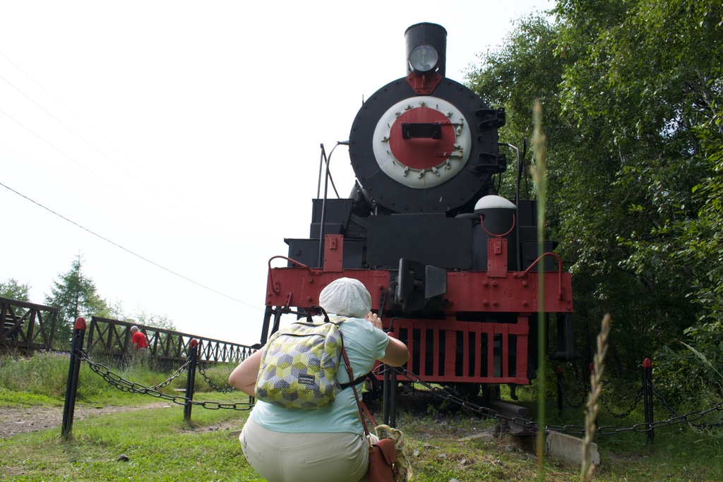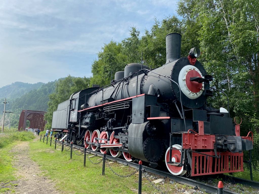 Недалеко от моста можно увидеть настоящий паровоз. Такие машины в 20 веке использовались здесь на КБЖД. Паровоз импортный: произведен в США. Такие машины Россия начала закупать во время Первой мировой войны, так как отечественных паровозов не хватало. Производились такие паровозы на американских заводах по российским чертежам.