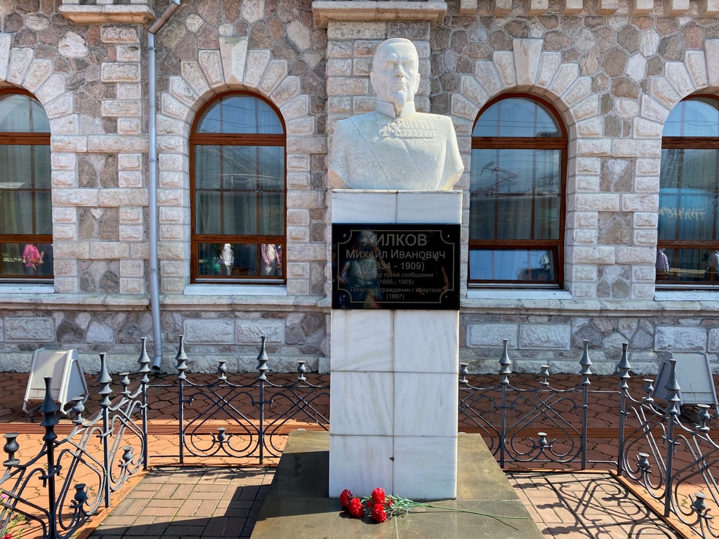 Рядом со входом установлен памятник Михаилу Хилкову. Он был министром путей сообщения России и стоял у истоков строительства вокзала в Слюдянке.