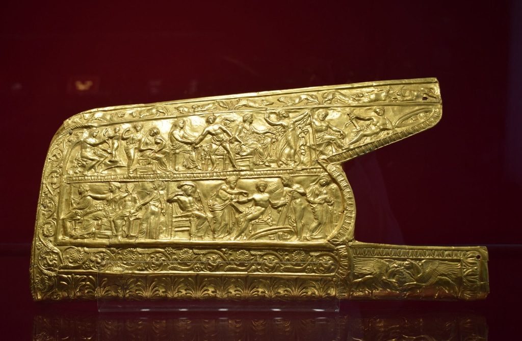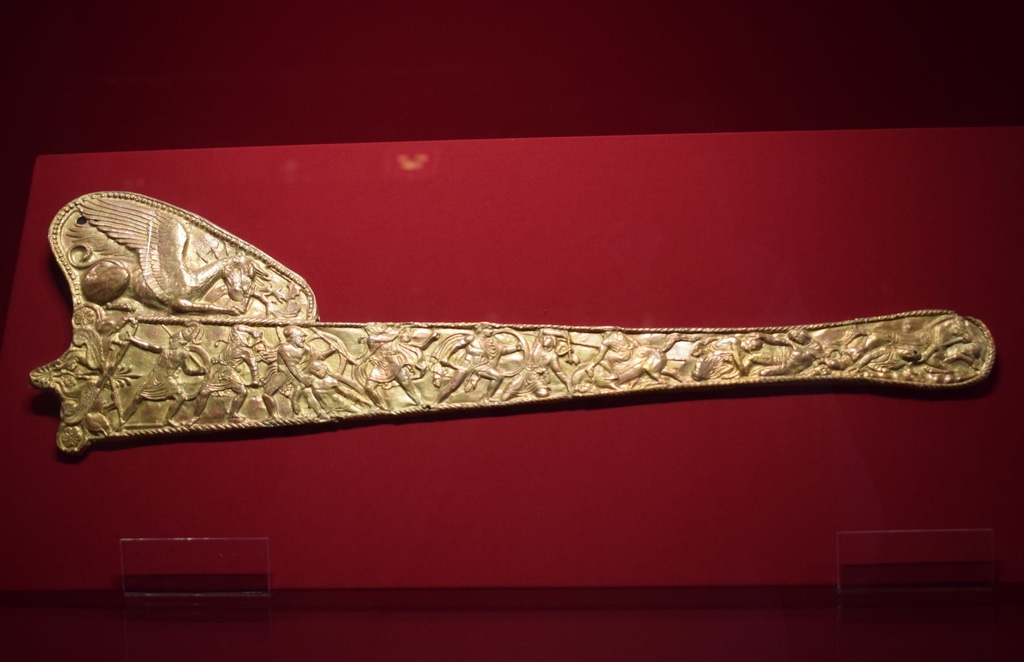 Неплохо сохранилась и золотая обкладка ножен для меча. На ней тоже изображены сцены из воинских сражений скифов с греками.