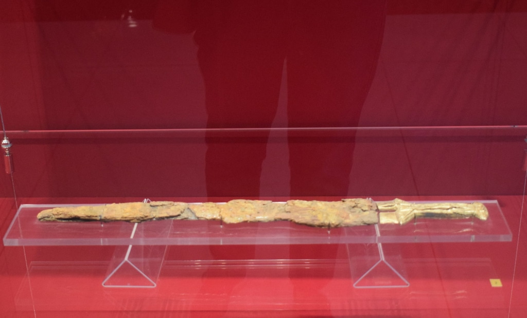 Скифский меч порядком заржавел, а вот ручка в золотой фольге гораздо лучше сохранилась.